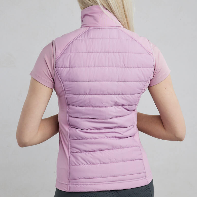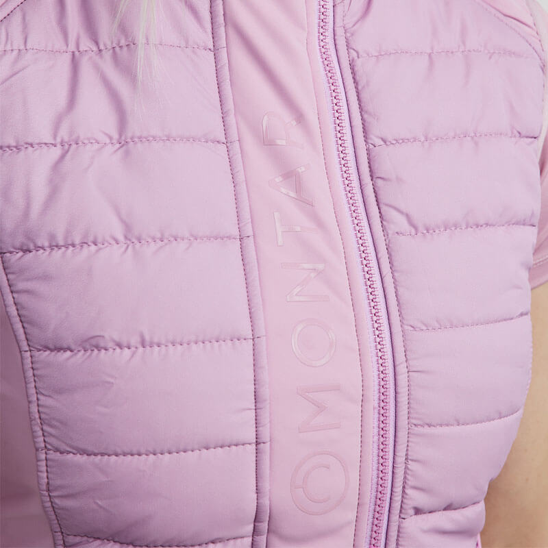 Bodywarmer Montar Emma Candy Pink. Een modieuze dames bodywarmer vervaardigd uit wind en waterafstotende stof. De bodywarmer is gewatteerd op de voor en achterzijde in combinatie met softshell materiaal aan beide zijde van het lichaam. De bodywarmer is voorzien van zakken met ritssluitingen en groot verticaal geplaatst Montar logo op de voorzijde.