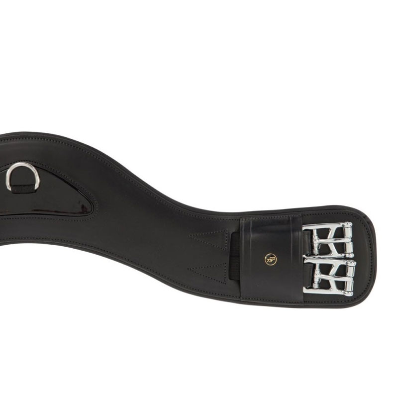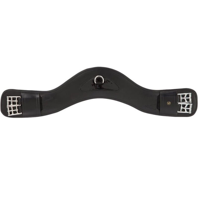 Anatomisch gevormde lederen dressuursingel model Borough van het merk BR. Met deze singel heeft het paard optimale bewegingsvrijheid. De dressuursingel is voorzien aan beide zijde van elastiek met rvs rolgespen en een D-ring in het midden ter bevestiging van eventuele hulpteugels. De singel is afgewerkt met een klein laklederen gedeelte in het midden.