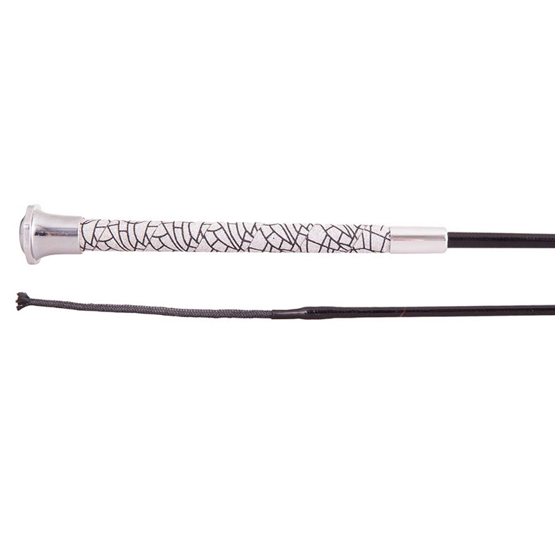 Dressuurzweep met Fiberglass kern en een zwarte stok. De speciale coating zorgt voor een lichte glans en langere levensduur. Ook het klapkoordje van +/- 10 cm lang is door de verstevigde coating extra duurzaam. De zweep heeft een opvallend anti-slip handgreep met een luxe zilverkleurige knop.