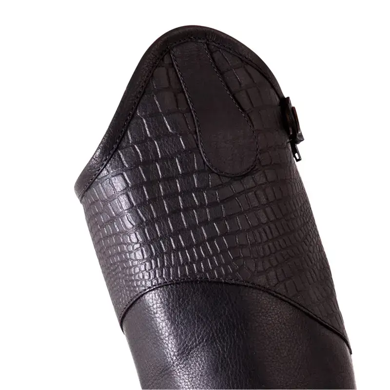 Sportieve lederen chaps van het merk BR model Gilenzo. De chaps zijn afgewerkt met krokodillen print aan de bovenzijde en op de hakbeschermer en zijn aan de achterzijde voorzien van ritssluiting in combinatie met elastiek.