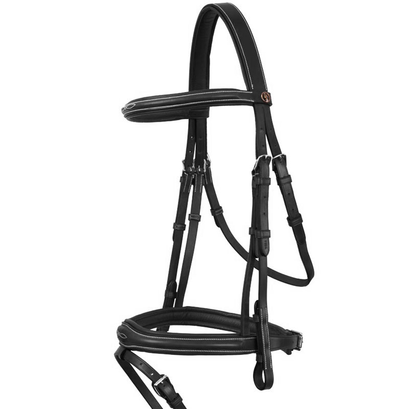 Hoofdstel vervaardigd uit Europese kwaliteit leder met zacht gevoerd kopstuk en zacht gevoerde, anatomisch gevormde neusriem. De neusriem en de frontriem van dit hoofdstel zijn rond gebombeerd en voorzien van decoratieve stiksels. De bakstukken zijn afgewerkt met blinde sluitingen.