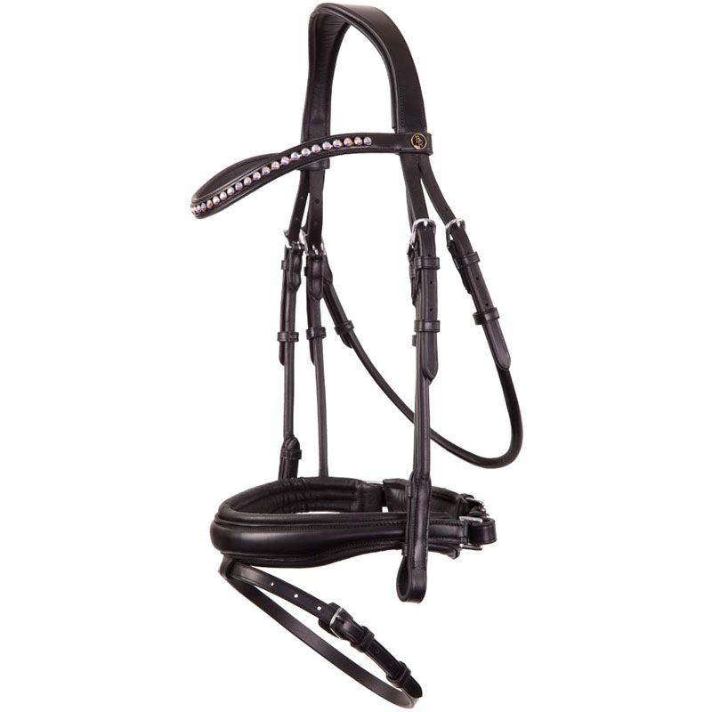 BR hoofdstel Southam is voorzien van een anatomisch gevormd zacht gevoerd kopstuk met extra vrijheid achter de oren van het paard. De gebogen frontriem is ingelegd met echte Swarovski stenen. Zowel de keelriem als bakstukken van dit hoofdstel zijn vervaardigd uit rondgenaaid leder waarvan de bakstukken zijn afgewerkt met blinde haakjessluitingen. Het hoofdstel is uitgevoerd met een 4 cm brede gecombineerde aansnoerneusriem met rondgenaaide lederen riemen ter bevestiging voor aan het kopstuk en heeft bit uitsparingen aan beide zijde van de neusriem. Dit hoofdstel wordt geleverd exclusief teugels.