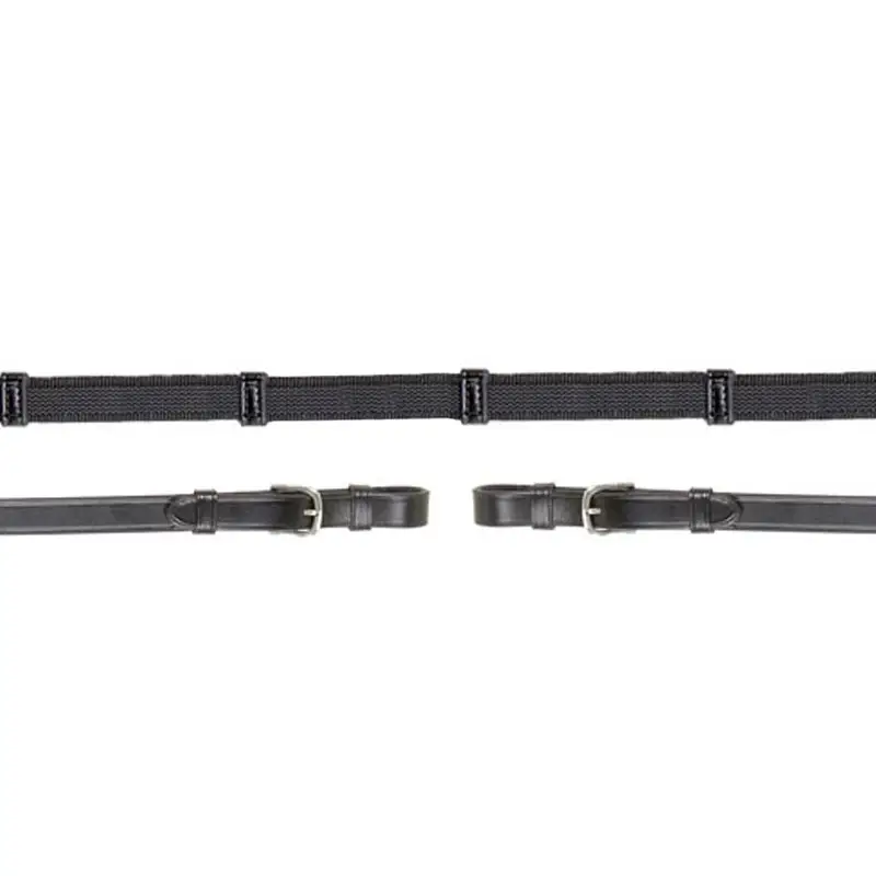 Linnen antislip teugels van het merk BR voorzien van ronde rvs gespsluitingen en lederen handstops.