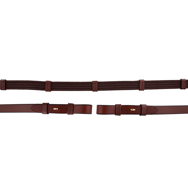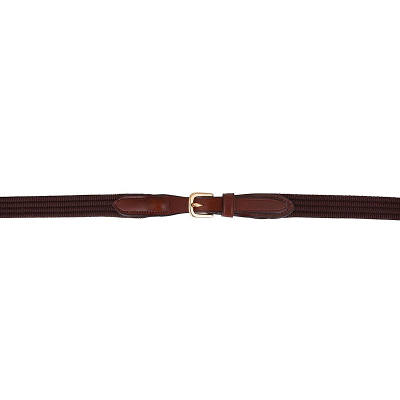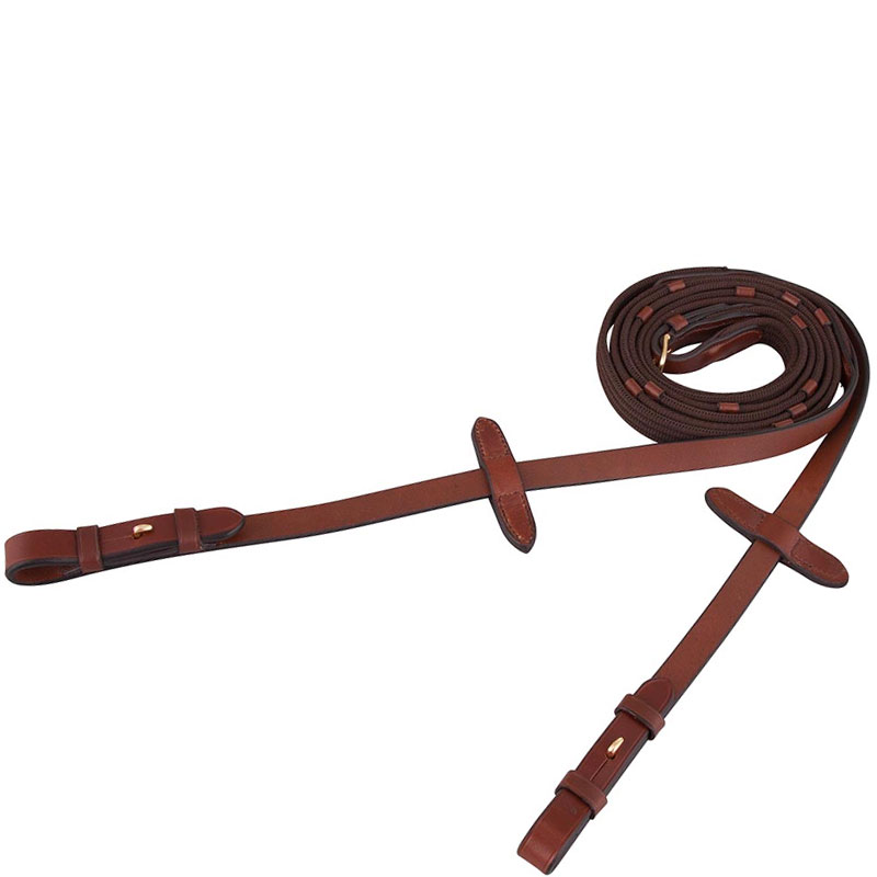 Linnen teugels van het merk BR voorzien van ronde rvs fournituren, blinde haakjessluitingen aan de uiteinde en lederen handstops.