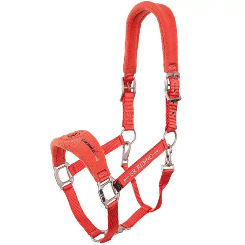 Halster van het merk BR vervaardigd uit polyproyleen met zacht fleece op het kopstuk en op de neusriem. Het halster heeft een dubbel verstelbare kopriem en de keelriem van dit halster is volledig los te halen voor het makkelijke borstelen.
