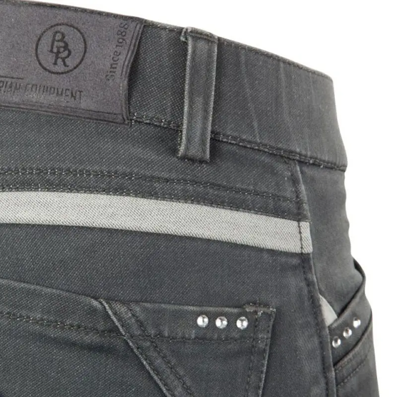 Jeans rijbroek van het merk BR model Mette voorzien van volledig siliconen zitvlak en elastisch gedeelte bij de enkels. De rijbroek is uitgevoerd met jeanspockets aan de voor- en achterzijde afgewerkt met imitatie diamanten.