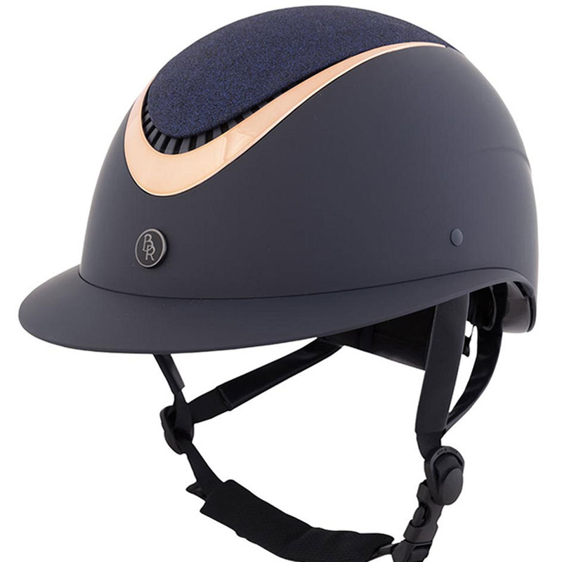 De BR Rijhelm Theta Plus Painted Glitter Navy/Rosegoud is uitgevoerd in een matte schaal in combinatie met een rosegoud frame langs de ventilatiesleuven en glitter materiaal over het midden gecentreerd. De cap is voorzien van een grote klep (vizier).