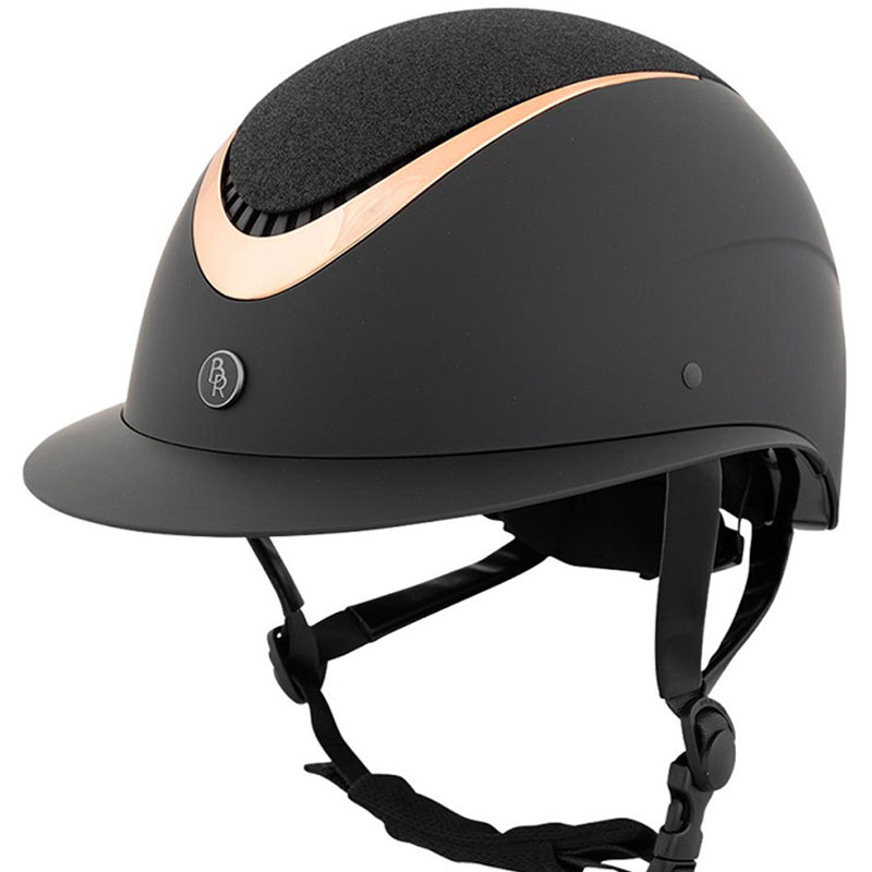 De BR Rijhelm Theta Plus Painted Glitter Zwart/Rosegoud is uitgevoerd in een matte schaal in combinatie met een rosegoud frame langs de ventilatiesleuven en glitter materiaal over het midden gecentreerd. De cap is voorzien van een grote klep (vizier).