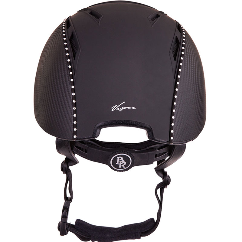 Lichtgewicht BR rijhelm met een comfortabele pasvorm en een aerodynamische vormgeving. De helm is aan beide zijden bekleed met Carbon. Twee zwarte biezen met Swarovksi® kristallen over de gehele lengte geven de helm een luxe uitstraling. De drie fijnmazige, zilverkleurige stalen ventilatieroosters aan de voorzijde en de diverse ventilatieopeningen aan de bovenzijde zorgen voor een uitstekende ventilatie. De Coolmax® voering van het interieur werkt verkoelend en droogt snel. De voering is volledig uitneembaar en kan in de wasmachine gewassen worden op 40°C. De helm is voorzien van een afneembaar helmschild. De hoofdring is verstelbaar met een draaischijf. De verstelbare 4-punts kinband met quick release gesp is aan de buitenzijde bekleed met kunstleder. De zachte voering om de kinband en de zachte nekbeschermer zorgen voor optimaal comfort. Beide zijn afneembaar met klittenband. De helm voldoet aan de CE VG1 01.040 2014-12 veiligheidsnormering.
