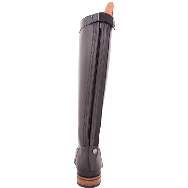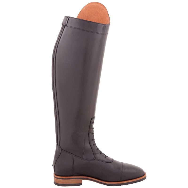 Stijlvolle rijlaarzen voor volwassene van het merk BR vervaardigd uit 1,6 tot 1,8 mm dik soepel, waterafstotend rundsleder met een soepele zacht varkenslederen voering. De rijlaarzen zijn voorzien van een ritssluiting in combinatie met italiaanse elastiek aan de achterzijde wat zorgt draagt voor een gemakkelijke instap. Zowel aan boven als onderzijde van de ritssluiting bevindt zich een lederen in lak uitgevoerde ritsbeschermer met drukknoopsluiting. De rijlaarzen hebben een elastische veter op de wreef, 7 cm hoog uitgesneden dressuurboog voorzien van lak accenten met strass steentjes, hoogwaardige natuurlijke rubber zool met uitstekende schokabsorberende eigenschappen, Texon tussenzool geintegreerd met metalen cambreur wat zorgt draagt voor goede stabiliteit en drukverdeling en een toplaag van 4 mm dik microfiber foam wat extra comfort biedt. De rijlaarzen zijn slank gesneden rond de enkel en hebben een doorgestikte vierkante sierneus.