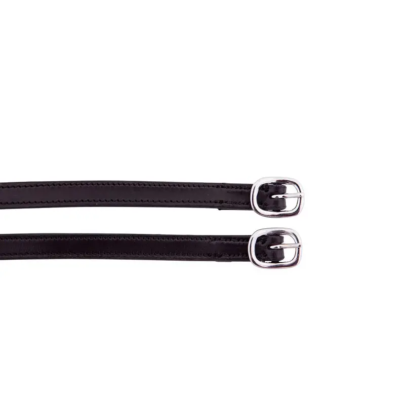 BR spoorriempjes Leder in het zwart voorzien van roestvrijstalen gespen. De sporriempjes zijn gestikt en hebben een lengte van ongeveer 48 cm met een breedte van 13 mm.