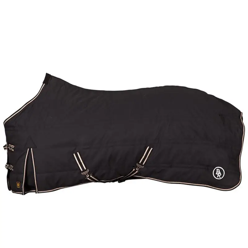 600 Denier waterafstotende staldeken van het merk BR. De deken heeft een vochtregulerende Cool Plus voering met nylon gedeelte op de borst en onderzijde van de deken ter voorkoming van schuren en het omhoogtrekken van water. De deken is met 300 grams Polyfill vulling gevoerd en heeft verzinkte fournituren met een aluminium finish.