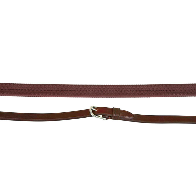 Eventa rubberen grip teugels met nylon inlage van het merk BR voorzien van ronde rvs gesp, blinde haakjessluitingen aan de uiteinde en teugelstops.