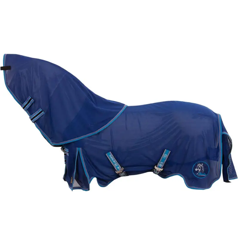 Vliegendeken met afneembaar halsstuk uit de BR 4-Ever Horses collectie. De buitenzijde van de deken is gemaakt uit polyester mesh en heeft op het borstgedeelte en aan de binnenzijde van de hals 190T nylon voering ter voorkoming van schuren. Het halsdeel is voorzien van drie klittenbandsluitingen en is te bevestigen aan de deken door het gebruik van drie elastische riemen met musketons. De deken is voorzien van een nieuw type verstelbare borstsluiting met wuick release gesp en brede klittenbandsluiting. Verder is de deken uitgevoerd met loopsplitten, verstelbare kruissingels, verstelbare lieskoorden en extra lange staartflap.
