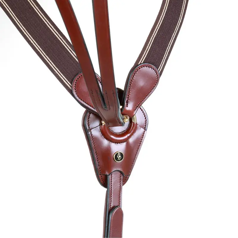 Europees lederen voortuig van het merk BR model Taunton. Het voortuig is voorzien van elastisch gedeelte in het halsdeel en verstelbare, afneembare martingaalvork. Het voortuig is op de meeste plaatsen zacht gevoerd en afgewerkt met roestvrijstale messing fournituren.