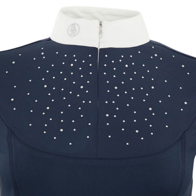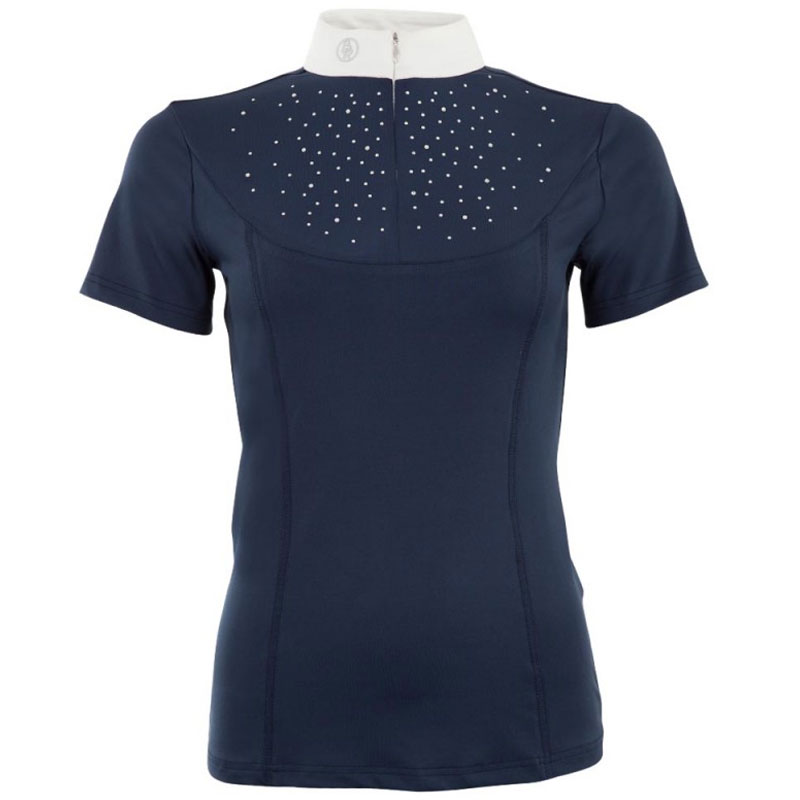 Sneldrogend en vochtregulerend wedstrijdshirt uit de BR collectie voorzien van opstaande kraag met ritssluiting, korte mouwen en een afwerking met strass steentjes en geborduurd BR logo op de kraag.