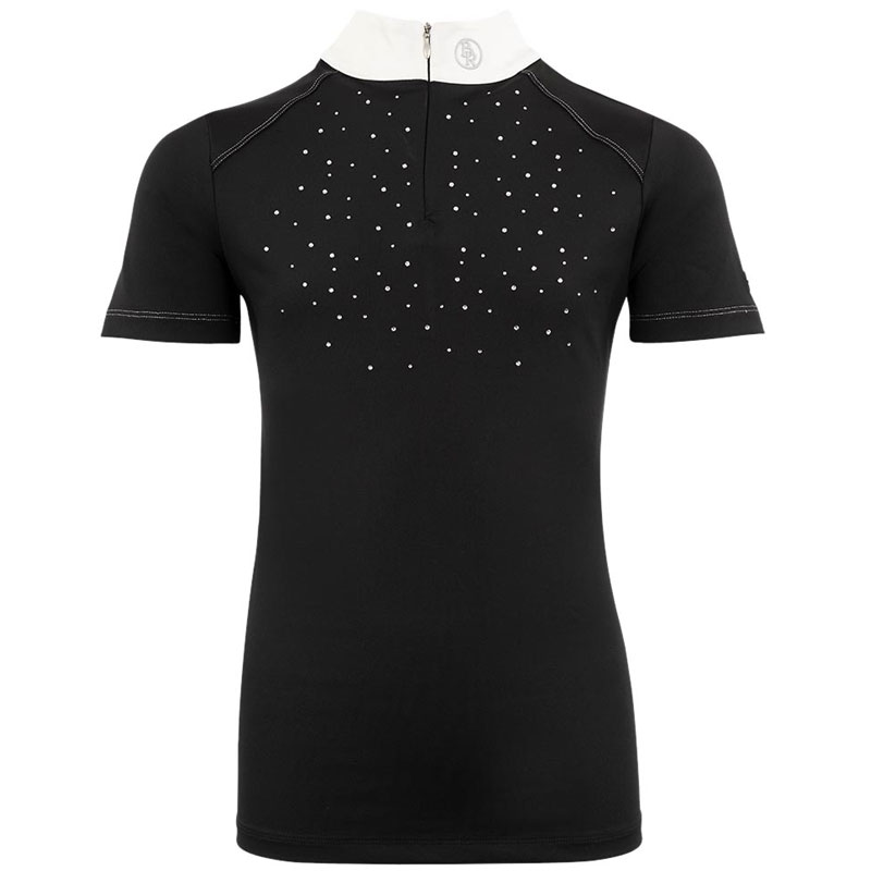 Het BR Wedstrijdshirt Dudley Kids zwart is gemaakt uit vochtregulerend en sneldrogend materiaal. Het shirt heeft een getailleerde pasvorm en is zeer comfortabel door de elastische stof. Het wedstrijdshirt is voorzien van opstaand wit gekleurd boordje met ritssluiting en is afgewerkt met imitatie diamenten details.