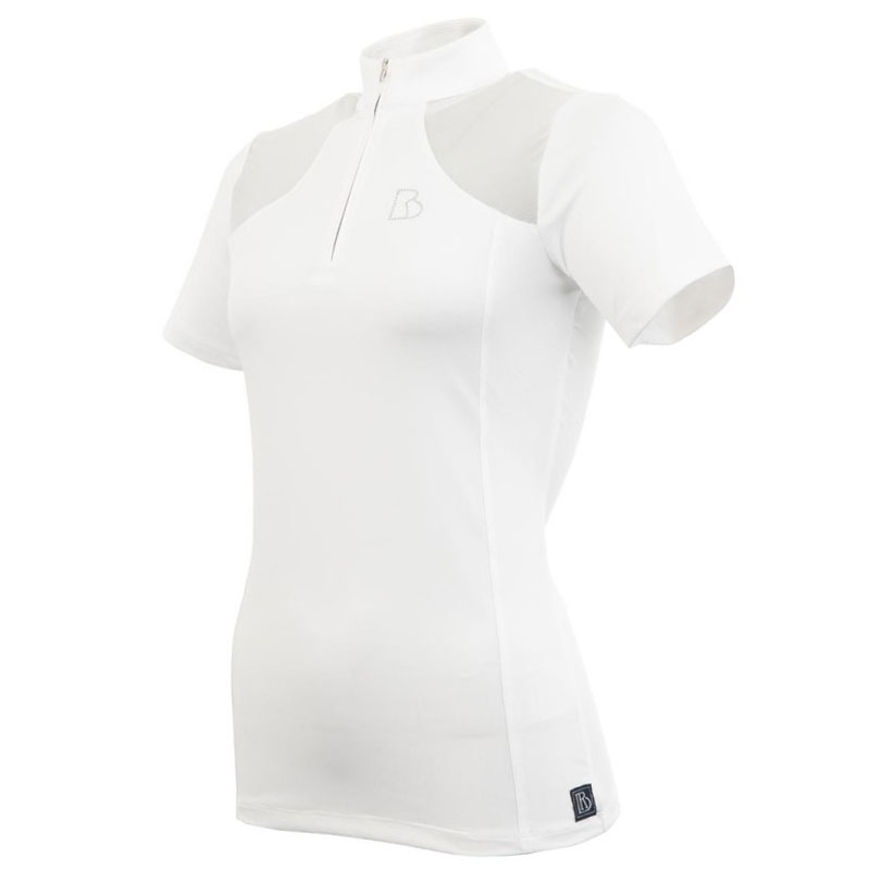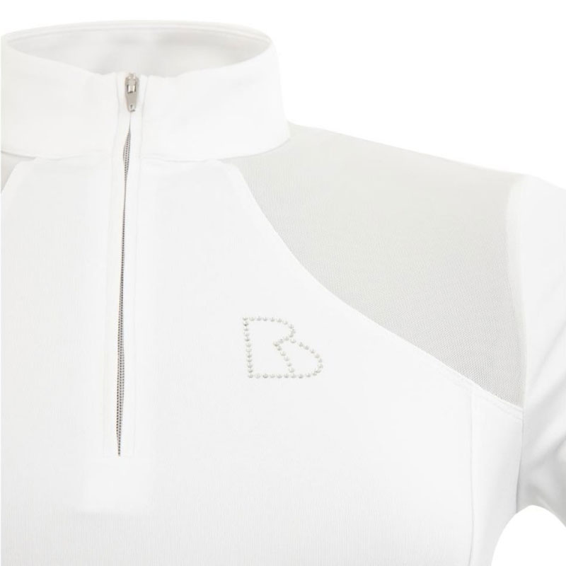 Modieus dames wedstrijdshirt vervaardigd uit vochtregulerende, ademende en sneldrogende stof. Het shirt is voorzien van korte mouwen, opstaande kraag met zilveren ritssluiting en is afgewerkt met logo op de borst en op de achterzijde.