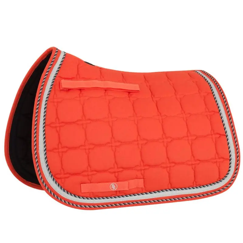 Poly katoenen zadeldek voorzien van een katoenen voering met 300 grams polyfill vulling met 10 mm foam. Het dekje is mozaiek tegelvormig gestept en heeft een anatomisch gevormde rugnaad en is afgewerkt met dubbele koordbies en zilverkleurige glitter tape.