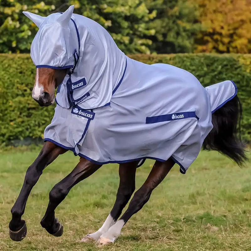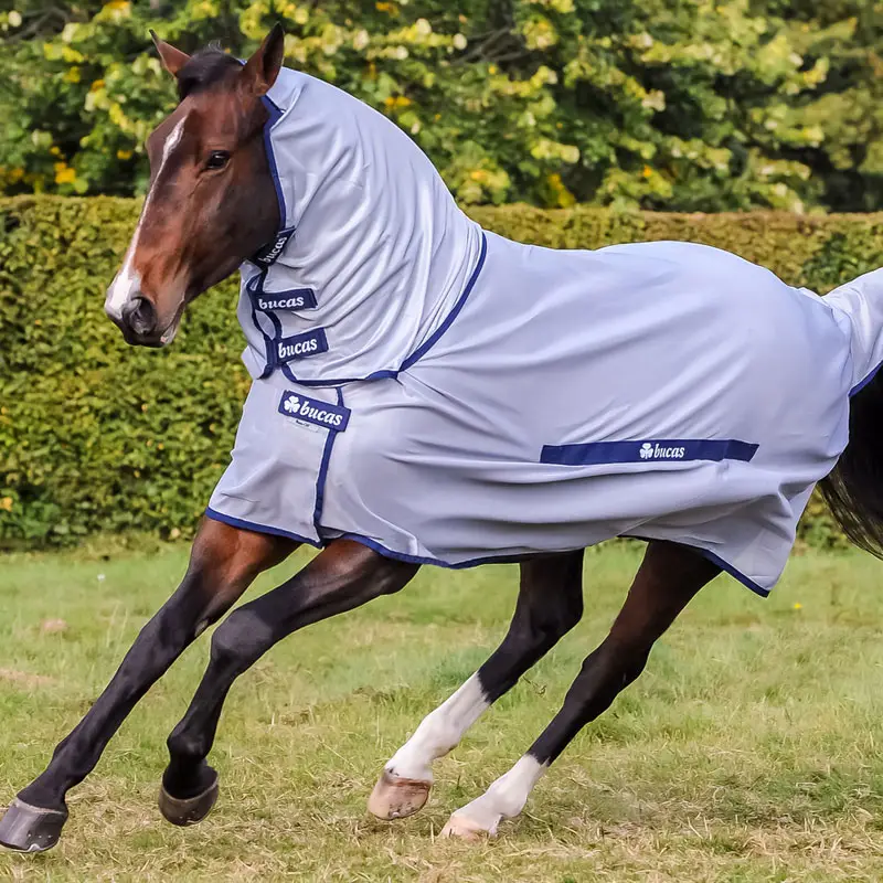 De Bucas Buzz-Off Full Neck is gemaakt van ademende fijne mesh stof en is voorzien van een vast halsstuk met dubbele klittenbandsluiting, een overlappend gevoerd borstgedeelte met Click ’n Go borstsluiting, elastiche en afneembare brede buikflap, beenkoorden en staartflap.