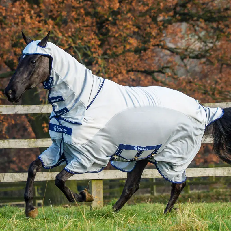 Deze deken is UV-werend en is uitgevoerd met extra lang halsstuk tot over de oren. De deken heeft extra lange zijkanten welke optimale beschermering biedt tegen vliegen en dazen. Ook is de deken voorzien van een brede buikflap welke wordt bevestigd door 3 singels.