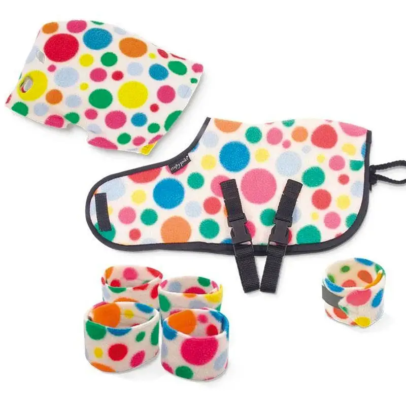 De Crafty Ponies Dekenset Met Hals Wit Gekleurd Gestipt zal helpen je Crafty Pony knuffelpaard lekker warm en knus te houden tijdens de koude nachten! Deze set is gebaseerd op een ‘echte’ pony set. Het is een leuk product, speciaal gemaakt voor kinderen om hun Crafty Pony paardenknuffel te verkleden en mee te spelen! De set komt compleet met een fleecedeken voorzien van kruissingels en klittenbandsluiting aan de voorkant, een bilkoord, halsstuk met masker en bandages met klittenbandsluiting. Het instructieboekje helpt kinderen meer te leren over de set.