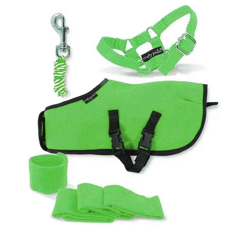 Crafty Ponies fleecedeken met kruissingels, halster, halstertouw, 4x bandages en een A5 formaat, 8 pagina’s Nederlands instructieboekje.
