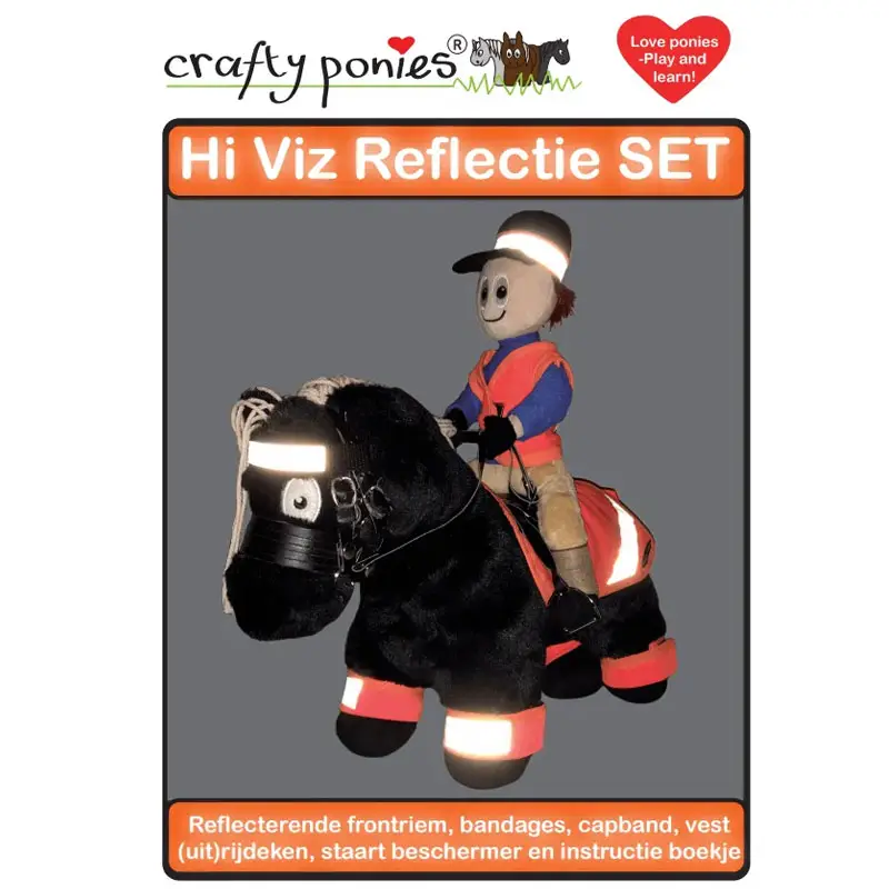 De Crafty Ponies Hi Viz Reflectie Set Fluor Oranje helpt kinderen de waarde in te zien van het zichtbaar en veilig buiten rond te rijden. De set is gemaakt van een hoogwaardige fluoriserende stof en heeft reflectie strepen welke oplichten wanneer er licht op valt. Bij het gebruik van deze set kan een buitenrit of een training worden nagespeeld en vallen zowel Crafty Pony en de ruiter goed op. Het boekje verteld over de zichtbaarheid op straat in het verkeer en bij ongevallen. De reflecterende frontriem, bandages, capband, vest (uit)rijdeken en staartbeschermer zorgen ervoor dat er vanuit iedere hoek goed zicht is.