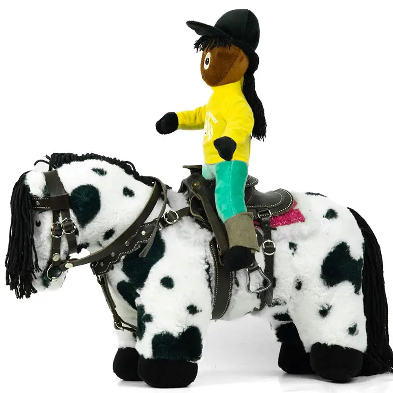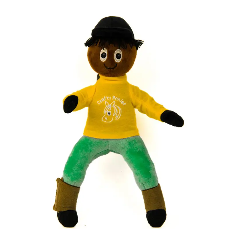 UitverkochtCrafty Ponies Ponyrijder Ruiter Alex. Alex is een jongen in een geel truitje met groene broek en heeft lange haren. De Crafty Ponies poppen komen in alle instructieboekjes voor en kinderen kunnen een rollenspel met ze spelen. De truien en chaps zijn afneembaar zodat de ruiters in “show kleding” kunnen worden gekleed. Daarnaast hebben ze ook elastiek op de handen zodat ze bijvoorbeeld een longeerlijn of loswerktouw kunnen vasthouden.