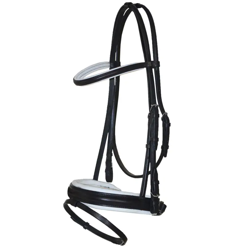 Topkwaliteit lederen hoofdstel van het merk Dobert. Het hoofdstel is voorzien van een deelbaar kopstuk en een recht model, wit onderlegde gevoerde frontriem. De aansnoerneusriem is 45 mm breed, wit onderlegd en tevens ook zacht gevoerd. Het hoofdstel wordt geleverd inclusief webband teugels met hand stops en gespsluitingen. Dit complete hoofdstel is gebombeerd. Dit houdt in dat het de looks heeft van een rondgenaaid hoofdstel, maar de afwerking tegen het hoofd van het paard is normaal vlak leder.