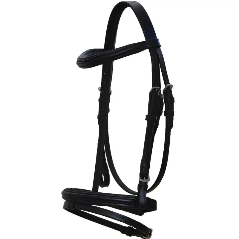 Import kwaliteit lederen hoofdstel van het merk Dobert. Het hoofdstel heeft een gevoerde frontriem en een 25 mm brede, gevoerde gecombineerde neusriem. Het hoofdstel is afgewerkt met zilverkleurige fournituren en wordt geleverd inclusief webband teugels met hand stops en gespsluitingen.
