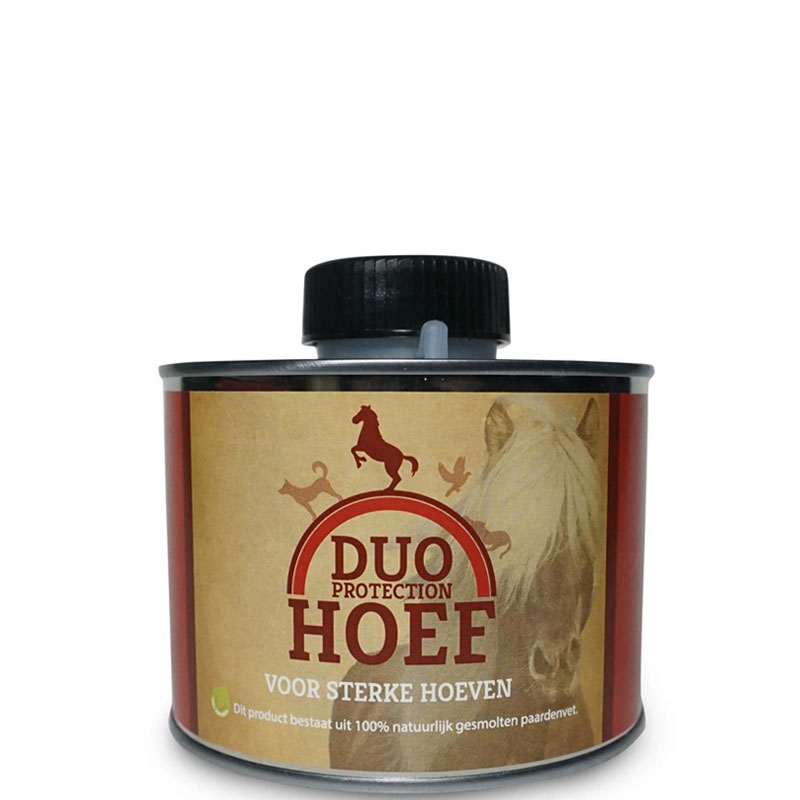 Duo Hoef 500 ml. Uit ervaring weten wij dat de meeste hoefsmeden tegen het invetten van hoeven zijn, omdat het de hoefwand afsluit. Duo Hoef doet dat niet. Omdat Duo Hoef 100% dierlijke olie (gesmolten paardenvet) is trekt het direct in de hoefwand.