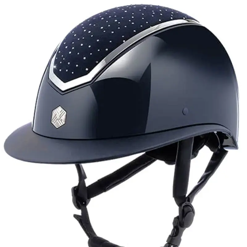 De EQX Kylo Crystal Wide Peak Navy Gloss/Zilver is geproduceerd voor Charles Owen. De EQX Kylo veiligheidscaps voldoen aan drie internationale veiligheidsnormen. Deze caps zijn verstelbaar door het gebruik van een goede kwaliteit draaiknop aan de achterzijde en zijn vervaardigd uit lichtgewicht materiaal. De Kylo Crystal Wide Peak is uitgevoerd met grote klep en heeft een glanzende zilverkleurige rand rondom de ventilatiesleuven in het midden in combinatie met fraaie crystal steentjes. De voering van deze caps zijn uitneembaar en kunnen gemakkelijk in de wasmachine worden gewassen.
