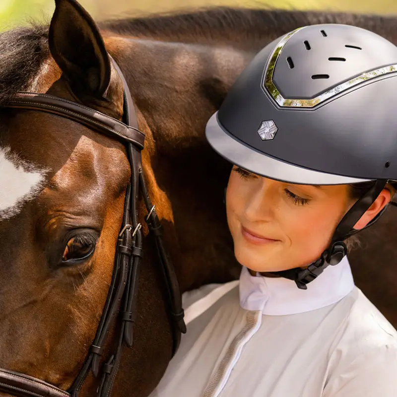 De EQX Kylo Navy Matt/Pewter is geproduceerd voor Charles Owen. De EQX Kylo veiligheidscaps voldoen aan drie internationale veiligheidsnormen. Deze caps zijn verstelbaar door het gebruik van een goede kwaliteit draaiknop aan de achterzijde en zijn vervaardigd uit lichtgewicht materiaal. Het model Kylo heeft een glanzende Glossy zilverkleurige rand rondom de ventilatiesleuven in het midden. De voering van deze caps zijn uitneembaar en kunnen gemakkelijk in de wasmachine worden gewassen.
