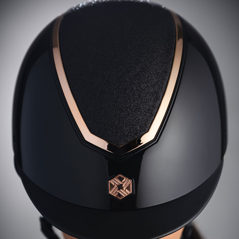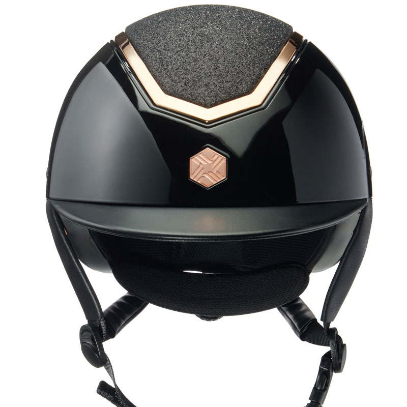 De EQX Kylo Sparkly Zwart Gloss/Rosegoud is geproduceerd voor Charles Owen. De EQX Kylo veiligheidscaps voldoen aan drie internationale veiligheidsnormen. Deze caps zijn verstelbaar door het gebruik van een goede kwaliteit draaiknop aan de achterzijde en zijn vervaardigd uit lichtgewicht materiaal. De Kylo Sparkly is uitgevoerd met een glanzende rosegoude rand rondom de ventilatiesleuven in het midden in combinatie met fraai zwart Sparkly (glitter) materiaal. De voering van deze caps zijn uitneembaar en kunnen gemakkelijk in de wasmachine worden gewassen.