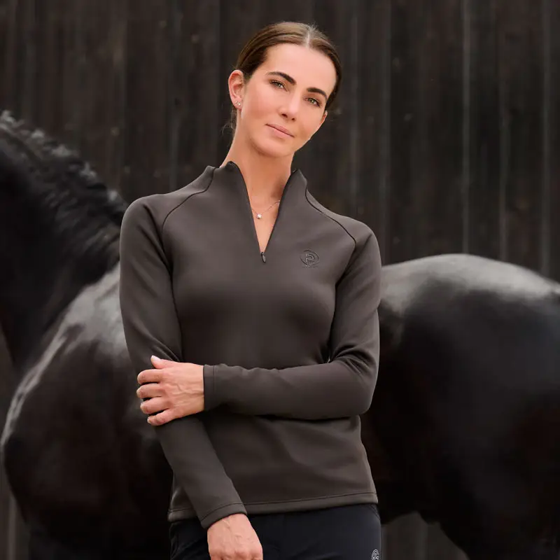 Eskadron Half Zip Shirt Platinum Teak Brown. Modieus dames shirt voorzien van lange mouwen en opstaand kraagje met rits. Het shirt is afgewerk met Eskadron Platinum logo op de borst.