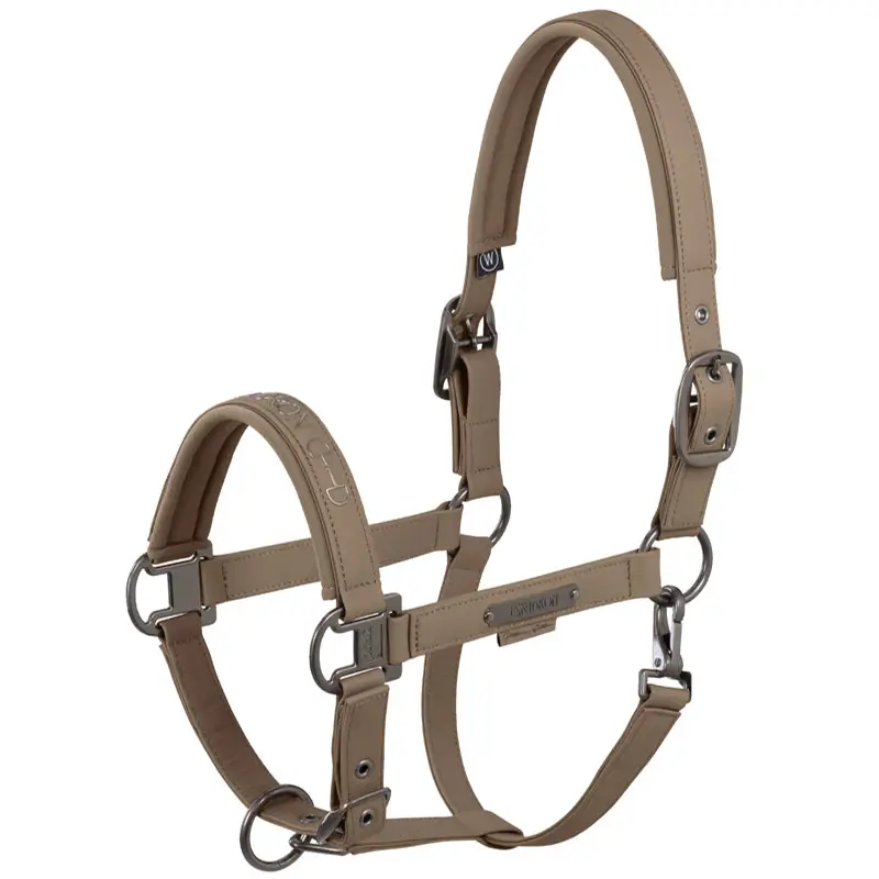 Eskadron Halster Faux Leather Platinum Smoky Taupe. Halster gemaakt uit kunstleder voorzien van dubbel verstelbare kopriem en verstelbare neusriem. Het halster is zacht gevoerd en afgewerkt met Eskadron naamplaatje op het linker bakstuk en print op de neusriem