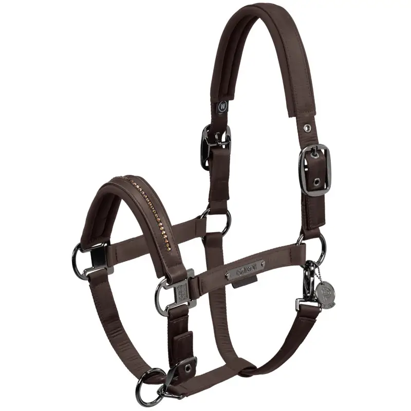 Het Eskadron Halster Glossy Crystal Platinum Teak Brown is bekleed met Glossy glanzend materiaal en is met zachte neopreen gevoerd onder het kopstuk en onder de neusriem. Het halster is afgewerkt met strass steentjes op de neusriem en metalen Eskadron badge op de kaaklijn aan de linker zijde. Verder is het halster voorzien van een verstelbare neusriem en een dubbel verstelbaar kopstuk.