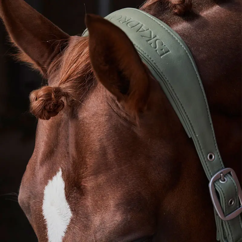 Het Eskadron halster Leer Platinum is een schitterend gevoerd halster in de kleur Ash Green. Het halster is voorzien van een anatomisch gevormd kopstuk in combinatie met een dubbele gesp. Op de neusriem en het kopstuk van het halster is het Eskadron logo zichtbaar evenals de Eskadron badge op het bakstuk aan de linker zijde.