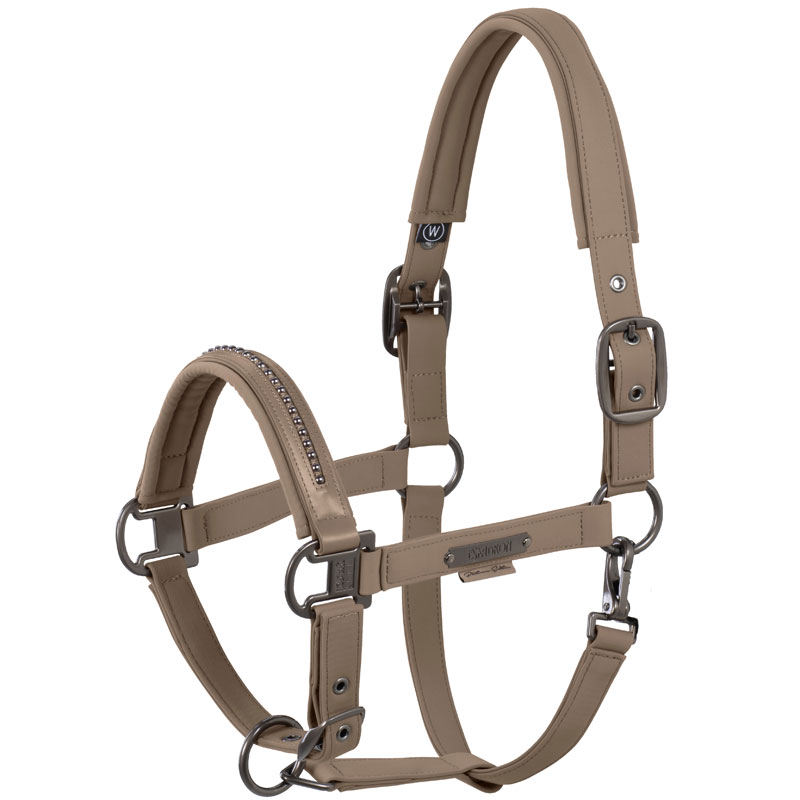 Eskadron Halster Softshell Pearls Platinum Smoky Taupe. Luxe halster gemaakt uit Softshell voorzien van dubbel verstelbare kopriem en verstelbare neusriem. Het halster is zacht gevoerd en afgewerkt met Eskadron naamplaatje op het linker bakstuk en parels over de neusriem.