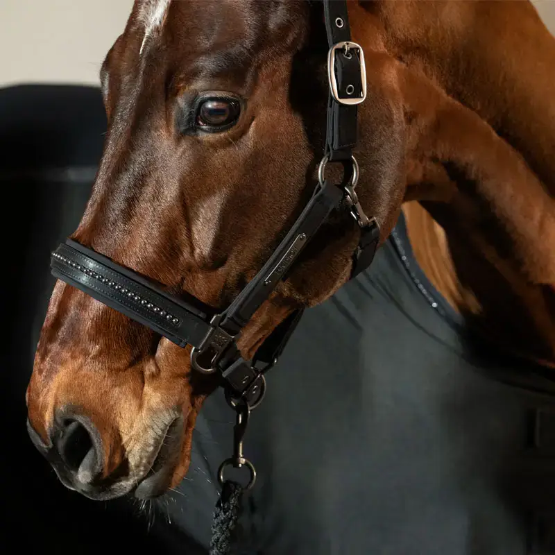 Eskadron Halster Softshell Pearls Platinum Zwart. Luxe halster gemaakt uit Softshell voorzien van dubbel verstelbare kopriem en verstelbare neusriem. Het halster is zacht gevoerd en afgewerkt met Eskadron naamplaatje op het linker bakstuk en parels over de neusriem.
