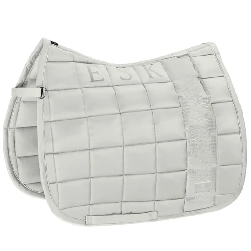 Het Eskadron zadeldek Big Square Glossy Platinum Pearl Grey is vervaardigd uit Glossy materiaal in combinatie met een schitterende Croco baan over de achterzijde. Het dekje is anatomisch gevormd en heeft een vochtregulerende voering voorzien van afneembare zadellussen met klittenbandsluiting en singellussen.