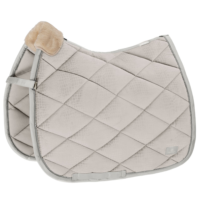 Het Eskadron zadeldek Velvet Croco Platinum Pearl Grey is een luxe anatomisch gevormd dekje voorzien van een afneembaar bontje op de schoft, afneembare singellussen en zadellussen met klittenbandsluiting. Het dekje is afgewerkt met een allover Croco print gedrukt in het velvet materiaal aan de buitenzijde.