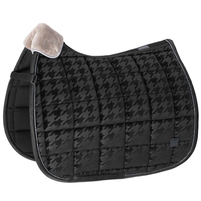 Het Eskadron Zadeldek Velvet Stamp Essence Zwart is een gelimiteerd zadeldek uit de nieuwste Eskadron Essence collectie. Het dekje is vervaardigd uit Velvet aan de buitenzijde afgewerkt met een Hahnentritt design en een afneembaar Faux Fur bontje op de schoft. Het dekje is verder voorzien van een goede kwaliteit vochtregulerende voering, afneembare zadellussen met klittenband en singellussen.