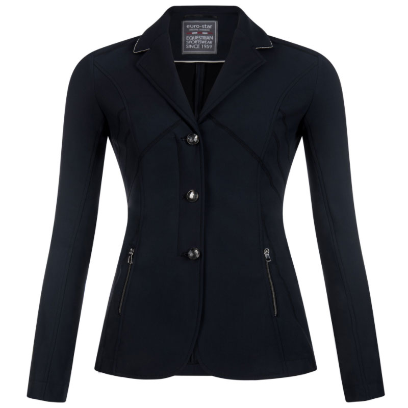Wedstrijdjasje Gabriella van het merk Euro-Star is vervaardigd uit een hoogwaardige elastische kwaliteit softshell. Het jasje is getailleerd en voorzien van crystal knopen, zakken met ritssluiting en een fraaie afwerking langs de kraag met subtiele glanzende ketting. Aan de achterzijde is het jasje uitgevoerd met een dubbele split.