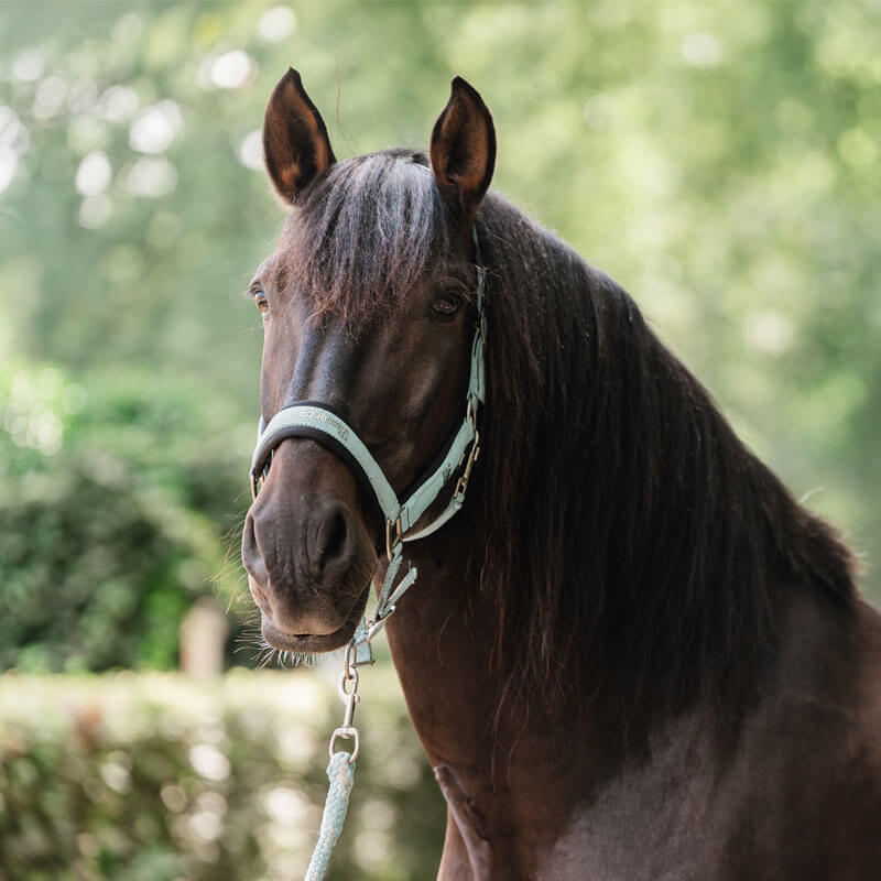 Halsterset EQPRO Precious Blue Reef. Halster met dubbel verstelbare kopriem en verstelbare neusriem. Het halster is met zacht mesh neopreen gevoerd op zowel het kopstuk als de bakstukken en neusriem. Wordt geleverd inclusief bijpassend halstertouw met musketon.