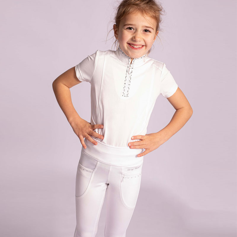 Harry’s Horse Equitights Rookie Full Grip Kids Wit. Kinder paardrijlegging gemaakt uit een elastische polyester stof voorzien van twee zakken waarvan één met ritssluiting en beide afgewerkt met subtiele kristal steentjes.