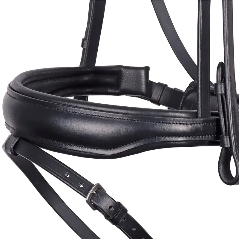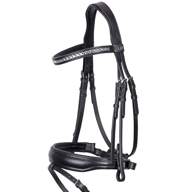 Het Harry’s Horse hoofdstel Drops is een mooi leren hoofdstel voorzien van zachte voering onder het anatomisch gevormde kopstuk en onder de neusriem. De frontriem van dit hoofdstel is afgewerkt met kristal steentjes. Compleet met bijpassende webbandteugels in combinatie met stops.