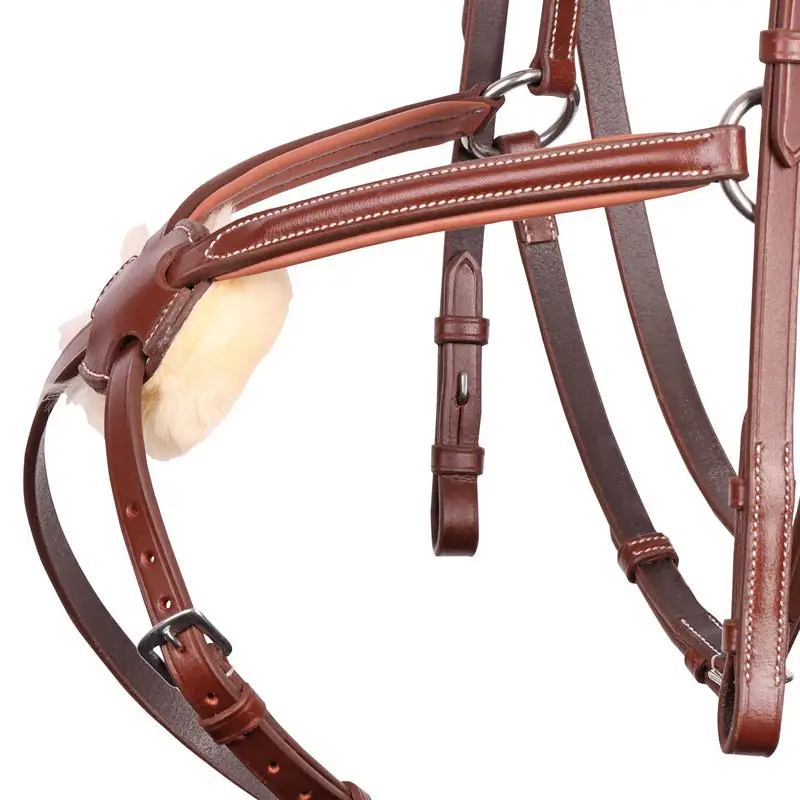 Het Harry’s Horse hoofdstel Mexicaans Bruin is zacht gevoerd onder de frontriem, neusriem en onder het kopstuk. Het hoofdstel is afgewerkt met contrast stiksels is voorzien van een wollen bescherming onder het midden van de neusriem. Het hoofdstel wordt compleet inclusief bijpassende webbandteugels met stops en haakjes sluitingen geleverd.