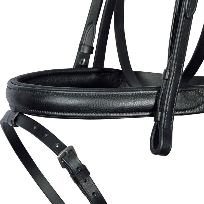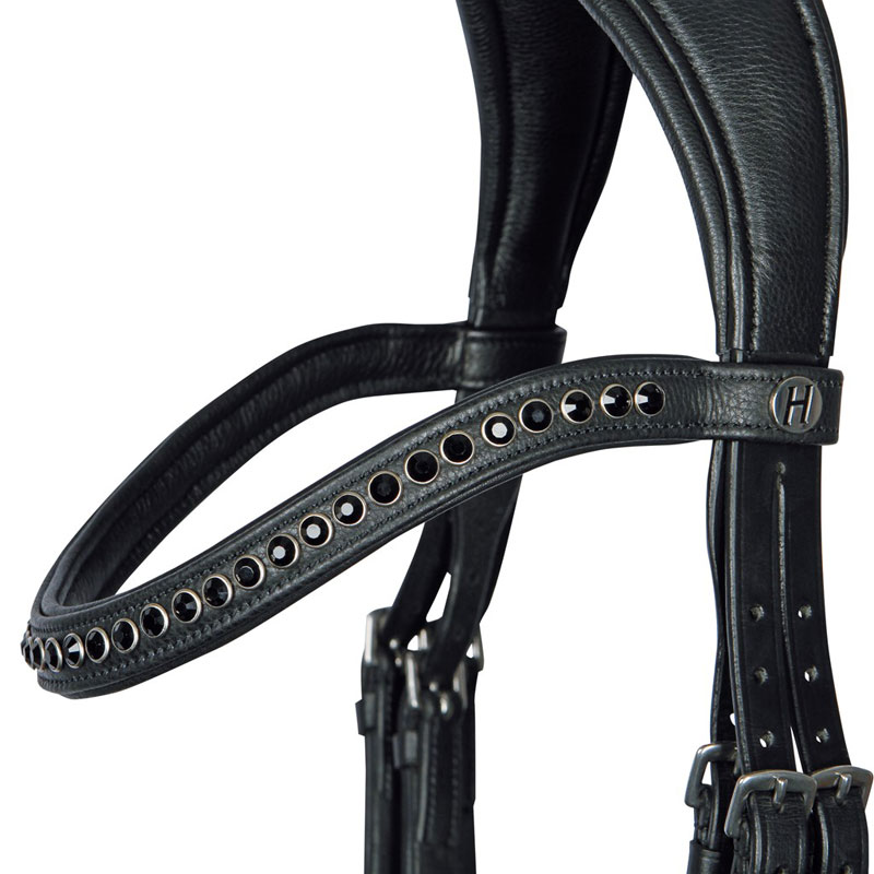 Harry’s Horse hoofdstel Nero Soft zwart/zwart. Anatomisch gevormd leren hoofdstel gemaakt uit zeer zacht leder. Het hoofdstel is uitgevoerd met een anatomisch gevormd kopstuk en een hangend model frontriem in combinatie met fraaie kristal steentjes. Wordt geleverd inclusief bijpassende teugels met stops en blinde sluitingen aan de uiteinde.